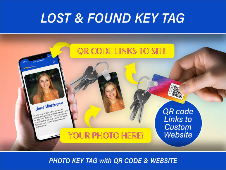 This personalized QR Code Photo Key Tag can be used as a simple “Lost and Found” tool for recovering your keys, luggage, or backpack … or you can send your My.1pg.Website URL to a new friend or business contact as a way to share all of your contact info and social media links within one page ... think of it like a digital business card!