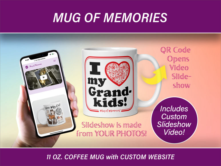 Doodad Graphics has created a way that takes personalization of a coffee mug to a whole new level! Your custom ceramic mug will be printed with your choice of 6 different designs. The unique QR code will link to a video slideshow of your most favorite and cherished photographs.